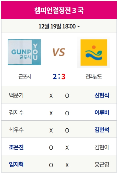 19일 경기도 판교 K바둑 스튜디오에서 열린 2025 KBF바둑리그 챔피언결정전 3차전에서 전남이 군포시를 상대로 3-2로 승리하며 대망의 우승을 차지했다. 전남은 초반 세 판을 내리 따내며 일찌감치 승기를 굳혔다.