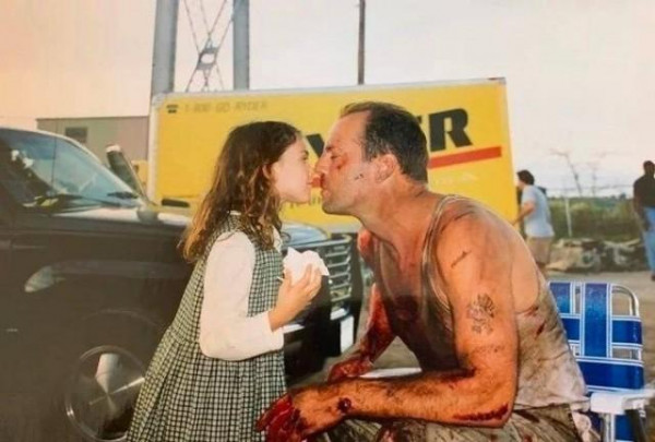 브루스 윌리스와 그의 딸은 영화 '디에어 하드'의 세트장에서 사진을 찍고 있습니다.