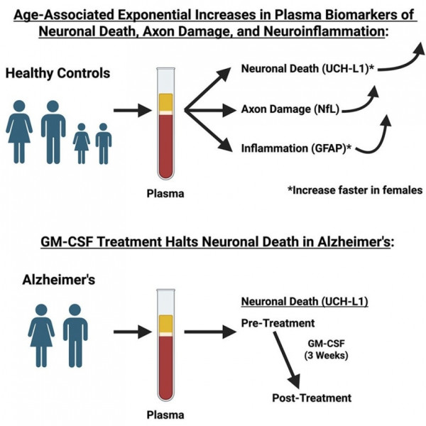 연구팀은 전 생애 인간 혈액 단면 연구를 통해 신경세포 손상·사멸 진행을 조사하고, 알츠하이머병 환자에게 사그라모스팀을 투여하는 임상시험과 알츠하이머병 동물 모델 실험을 통해 사그라모스팀 효과와 작용 기전을 조사했다.