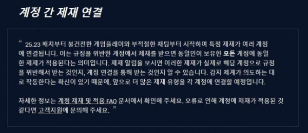 △ 25.23 패치로 계정간 제재 연결이 강해졌다. 간단히 말해, 부계정이 정지되면 본계정도 정지된다. 반대도 마찬가지.