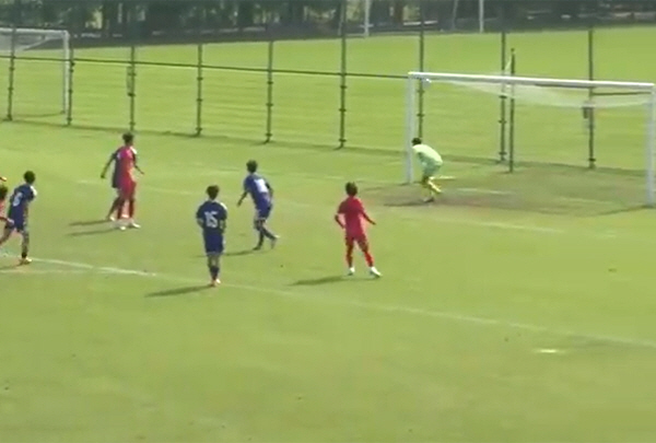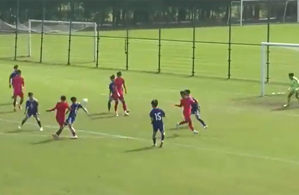 대한민국 U-15 대표팀 정우진 한-일전 골 장면. 중계화면