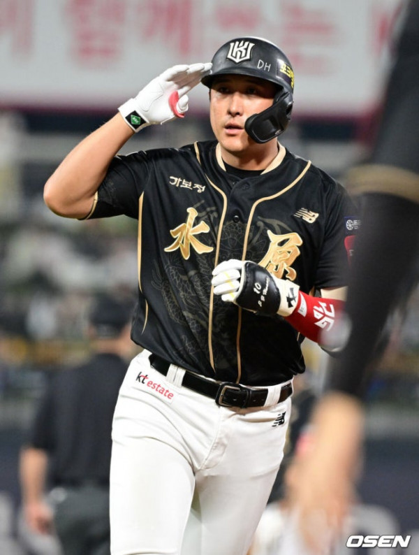 [OSEN=수원, 조은정 기자]9일 오후 수원 KT 위즈 파크에서 ‘2025 신한 SOL BANK KBO리그’ KT 위즈와 두산베어스의 경기가 열렸다. 이날 경기 KT는 소형준을, 두산은 곽빈을 선발투수로 내세웠다.7회말 1사 1,3루에서 KT 황재균이 적시타를 날린 뒤 세리머니를 하고 있다. 2025.09.09 /[email protected]