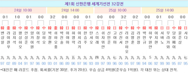32강에서는 한중전 6판, 한일전 6판, 한대전 2판 등이 벌어진다. 대진은 동일국 대결을 최소화하는 원칙 하에 4강전까지 매 라운드 추첨으로 정한다.