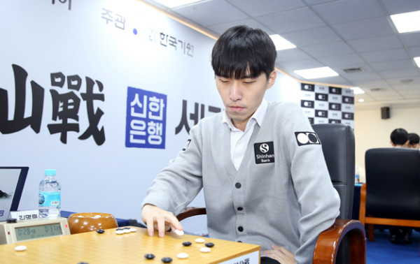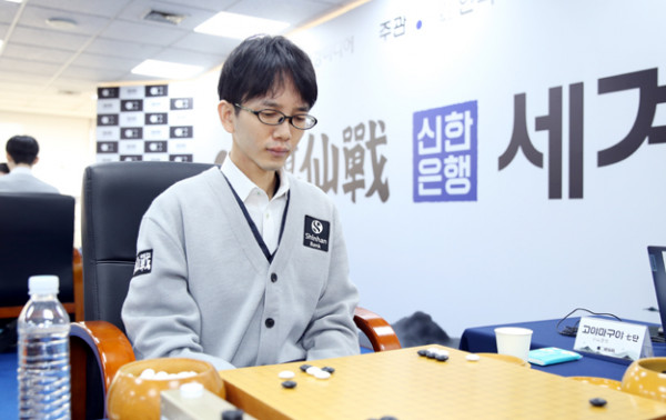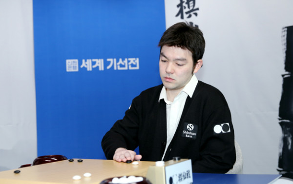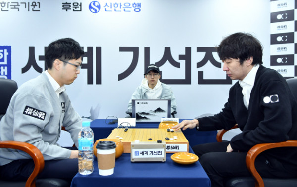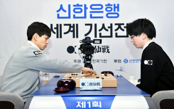 ▲ 한국랭킹 4위 신민준 9단(오른쪽)이 세계대회 본선에 첫선을 보인 고야마 구야 7단을 완파했다. 207수 불계승.