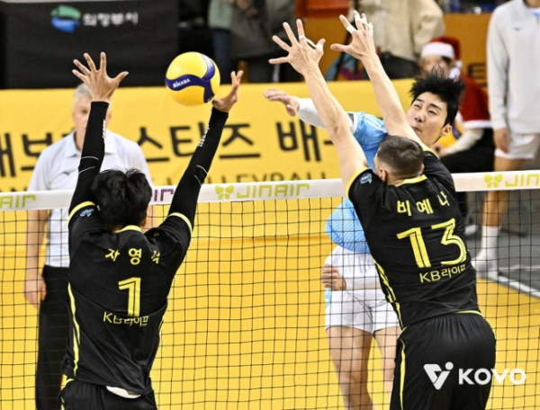 KB손해보험은 25일 경기도 의정부 경민대체육관에서 열린 2025-26시즌 진에어 V-리그 남자부 경기에서 대한항공에 세트스코어 3-1(19-25, 27-25, 25-21, 25-20)로 역전승했다.