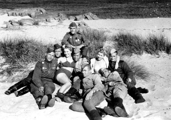 1945년 덴마크 보른홀름 해변에서 소련 군인들이 현지 여성들과 함께 휴식을 취하고 있다.