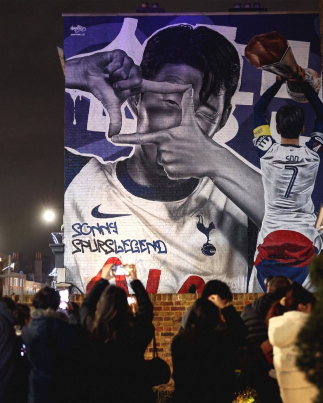 10일 공개된 영국 런던의 토트넘 하이 웨이에 새겨진 토트넘 손흥민의 기념벽화. 그의 고유 세리머니와, 2024~25시즌 UEL 우승 트로피를 들어올리는 장면이 담겼다. 사진=토트넘 SNS