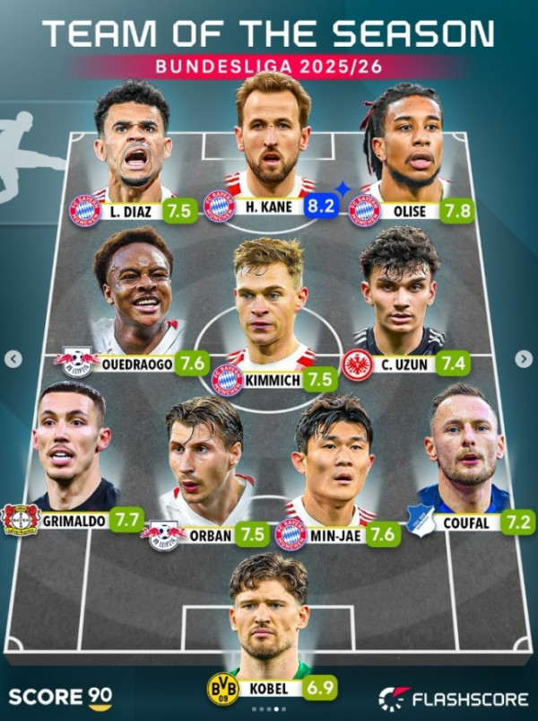 축구 콘텐츠 제작 사이트 스코어90은 지난 22일 축구 통계 사이트 플래시스코어의 평점을 기준으로 '2025-2026시즌 유럽 5대 리그 전반기 베스트 11'을 선정해 발표했다.