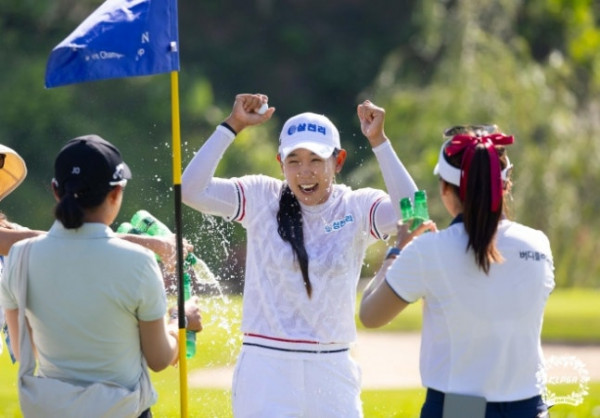 지난 3월 시즌 개막 대회였던 블루캐니언 레이디스 챔피언십에서 우승한 박보겸이 물세례를 받으며 환호하는 모습. KLPGA 제공