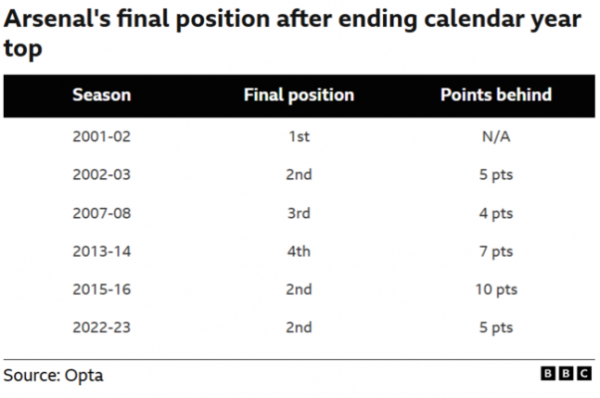 다만 아스날에게는 늘 따라붙는 질문이 있다. 정말 이번에는 다를까. 아스날은 최근 세 차례 연속 준우승에 머물렀고, 마지막 우승은 2003-2004시즌, 이른바 '무패 우승' 이후 22년 전이다. 실제로 아스날은 과거 여섯 차례나 연말 리그 1위로 한 해를 마쳤지만, 그중 우승으로 이어진 시즌은 단 한 번뿐이었다(2001-2002시즌).