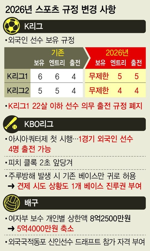 외국인 선수 동시 출전 최대 인원은 제한을 둔다. K리그1은 기존 4명(엔트리 등록 6명)에서 5명(엔트리 등록 5명)으로 늘어난다. K리그2는 출전 가능 인원(4명)은 변동 없지만 엔트리 등록이 5명에서 4명으로 바뀐다. 연맹은 “아시아챔피언스리그와 (일본 등) 주변국 리그의 외국인 선수 보유 확대 추세에 맞춰 K리그 국제 경쟁력을 강화하기 위한 취지”라고 설명했다. 외국인 골키퍼 등록도 허용된다. K리그1에서 22살 이하(U-22) 선수의 의무 출전 규정도 폐지된다.