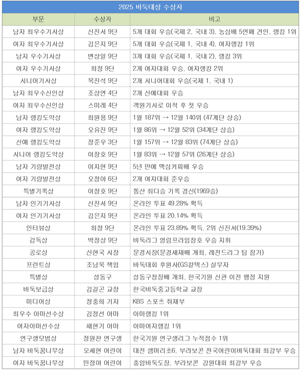 '바둑대상'이 대대적으로 개편됐다. 31일 오후 한국기원에서 열린 2025 바둑대상은 종전에 볼 수 없었던 상들이 주인공을 찾아갔다.