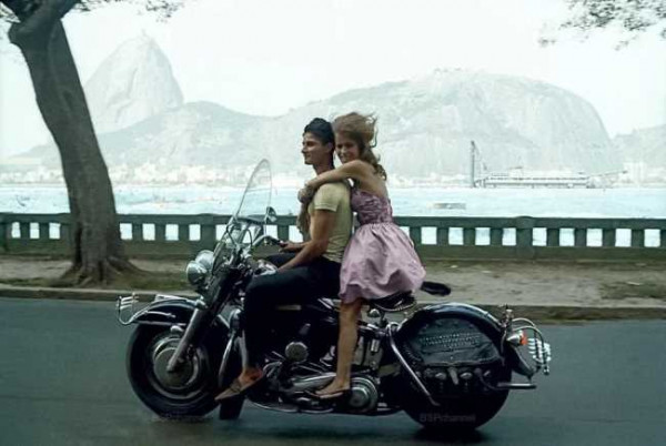 1963년 브라질 리우데자네이루에서 오토바이를 탄 한 커플.