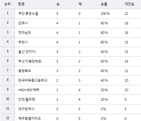 | 순위 | 팀 | 경기 | 승 | 무 | 패 | 승점 |