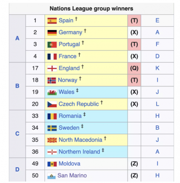 다시 말해, 산마리노가 최종전에서 패하더라도 루마니아가 조 2위에 오르고, 웨일스 혹은 북아일랜드 중 한 국가라도 조 2위를 차지하면 네이션스리그 순위 승계로 플레이오프 티켓을 손에 넣을 수 있다.