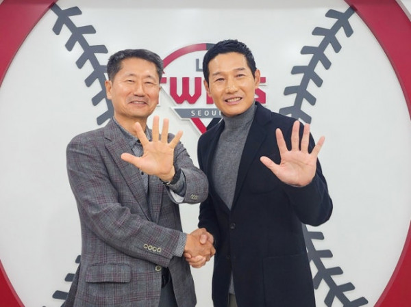 염경엽(오른쪽) LG 감독이 3년 재계약 후 김인석 대표이사와 구단 역대 5번째 우승에 도전하는 의미로 손가락 5개를 펼쳐보이고 있다. 사진=구단 제공