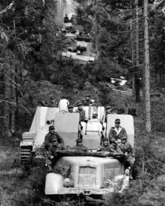 독일 장갑차가 숲을 가로지르고 있습니다. 전경에는 flak 38 사격포 4문이 장착된 zsu sd.kfz. 7_1이 보이고, 그 뒤로는 중전차 파괴자 _nashorn_이 1944년에 이동하고 있습니다.