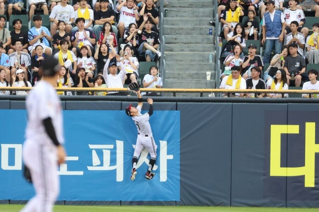 ▲ 2사 무사 상황에서 김재환의 홈런성 타구를 환상적인 수비로 건져내고 있는 박해민 ⓒLG트윈스
