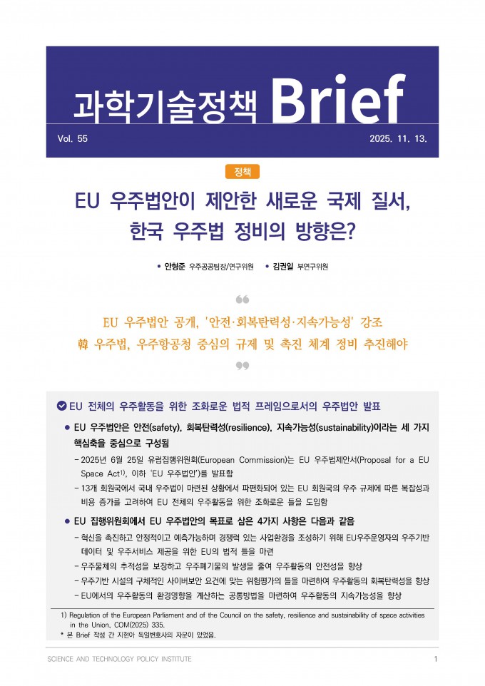 과학기술정책연구원(STEPI)은 EU 우주법안의 핵심 내용을 분석하고 한국 우주법 정비 방향을 제시한 ‘과학기술정책 Brief’ 제55호를 발간했다고 16일 밝혔다.