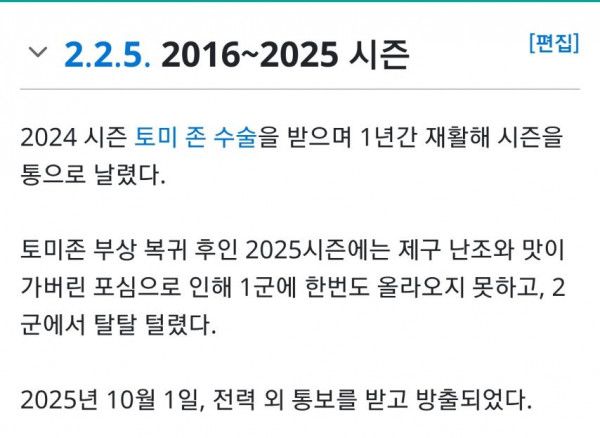 잦은 부상으로 인해 투구폼 무너지고 제구력도 점점 난조....결국 입단 14년차를 마친 지난 10월에 구든으로부터 방출 통보
