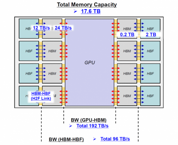 HBF는 HBM의 대체재가 아닌 추가 요소 개념이다. 역할은 비슷하지만 조금 다르다. HBM이 처리할 수 없는 대용량 데이터는 네트워크로 연결된 데이터센터에서 전송된다. HBF의 역할은 데이터센터 일부를 가져와 GPU 옆에 붙여주는 것이다. GPU는 HBM과, HBM은 HBF와 데이터를 주고받는다. HBM이 자주 쓰는 정보를 두는 책장이라면 HBF는 도서관에 비유된다.