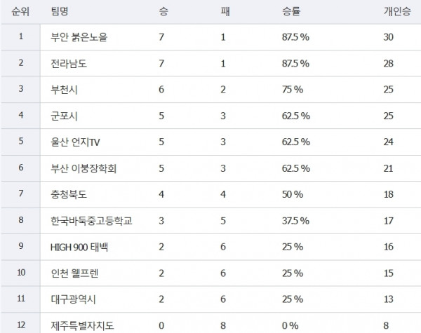 5라운드까지 파죽의 5연승을 달리던 디펜딩 챔피언 부안 붉은노을은 6라운드에서 부산 이붕장학회에 덜미를 잡히며 잠시 주춤했다. 하지만 이내 전열을 가다듬고 7, 8라운드를 승리하며 선두 자리를 지켜냈다.