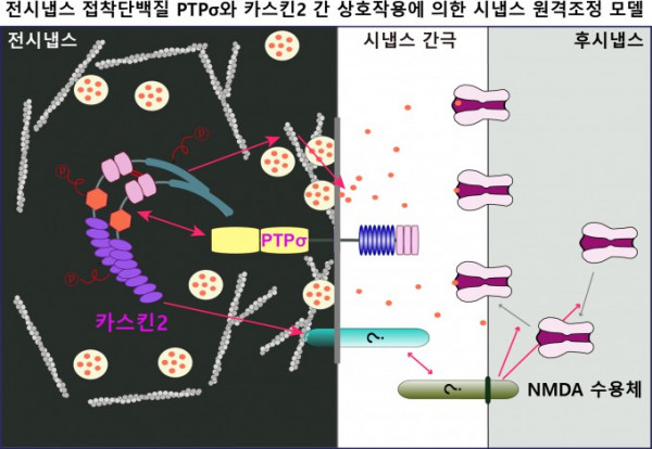 연구팀은 시냅스 전 말단에 있는 카스킨2가 시냅스의 기능과 강도를 조절하는 핵심 인자라는 사실을 확인했다. 신호를 보내는 신경세포의 카스킨2 PTPσ라는 다른 단백질과 상호작용하며 신호를 받는 세포의 기능까지 직접 조절했다.