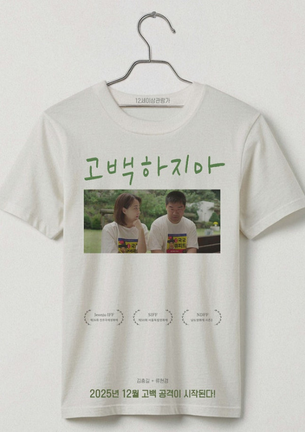 공개된 티저 포스터는 흰 티셔츠에 영화 장면을 그대로 인쇄한 듯한 형태로 디자인돼 마치 실물 굿즈를 보는 듯한 착시를 준다. 티셔츠 중앙에는 김충길과 류현경이 나란히 앉아 눈빛을 주고받는 장면이 담겼다.