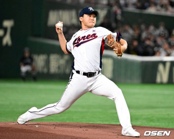 [OSEN=도쿄(일본), 조은정 기자] 16일 오후 일본 도쿄돔에서 ‘2025 NAVER K-BASEBALL SERIES’ 대한민국과 일본의 2차전 경기가 열렸다.한국은 정우주, 일본은 카네마루 유메토를 선발투수로 내세웠다.1회초 무사에서 대한민국 선발투수 정우주가 역투하고 있다. 2025.11.16 /[email protected]